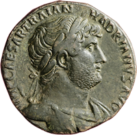 obv. Head of Nero, laureate, right; small globe at point of neck, surrounded by the legend; IMP NERO CAESAR AVG P MAX TR POT P P rev. Nero, bare-headed and togate, standing left, with praetorian prefect on platform, raising right hand to three soldiers; foremost carries standards; behind, battlemented structure above pillared building, S – C across fields in exergue; ADLOCVT COH
